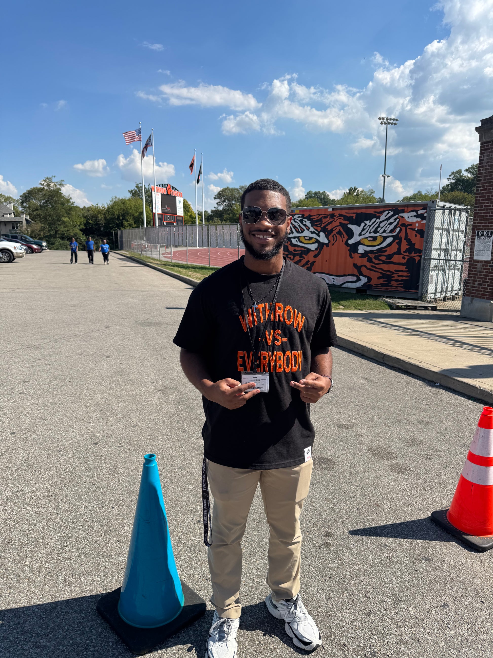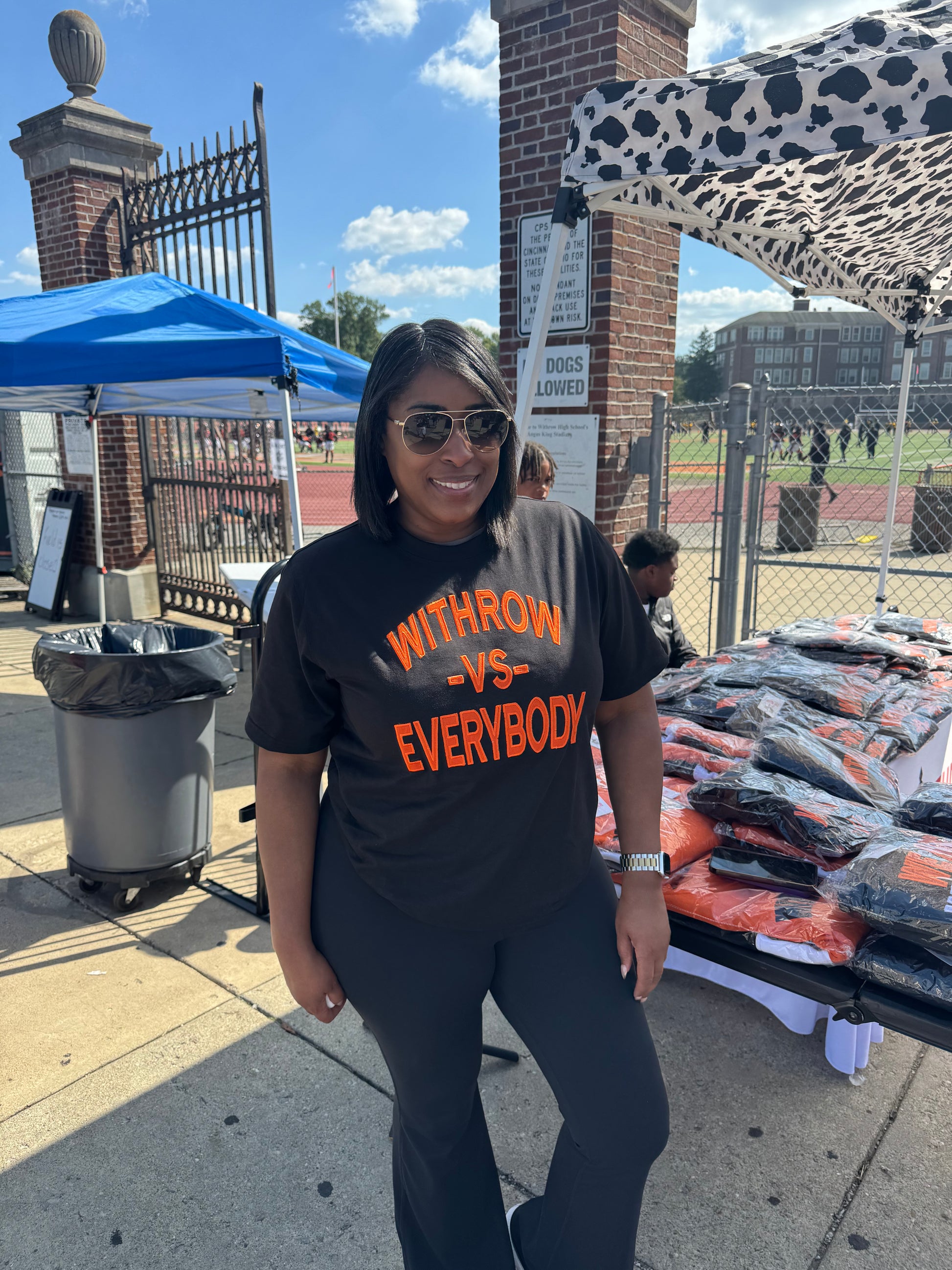 The front of the shirt prominently features the slogan "Withrow vs Everybody" in striking, attention-grabbing font, underscored by the school's colors. This powerful message conveys a sense of camaraderie and resilience, emphasizing the strong bond among Withrow Tigers as they stand together against any challenge.